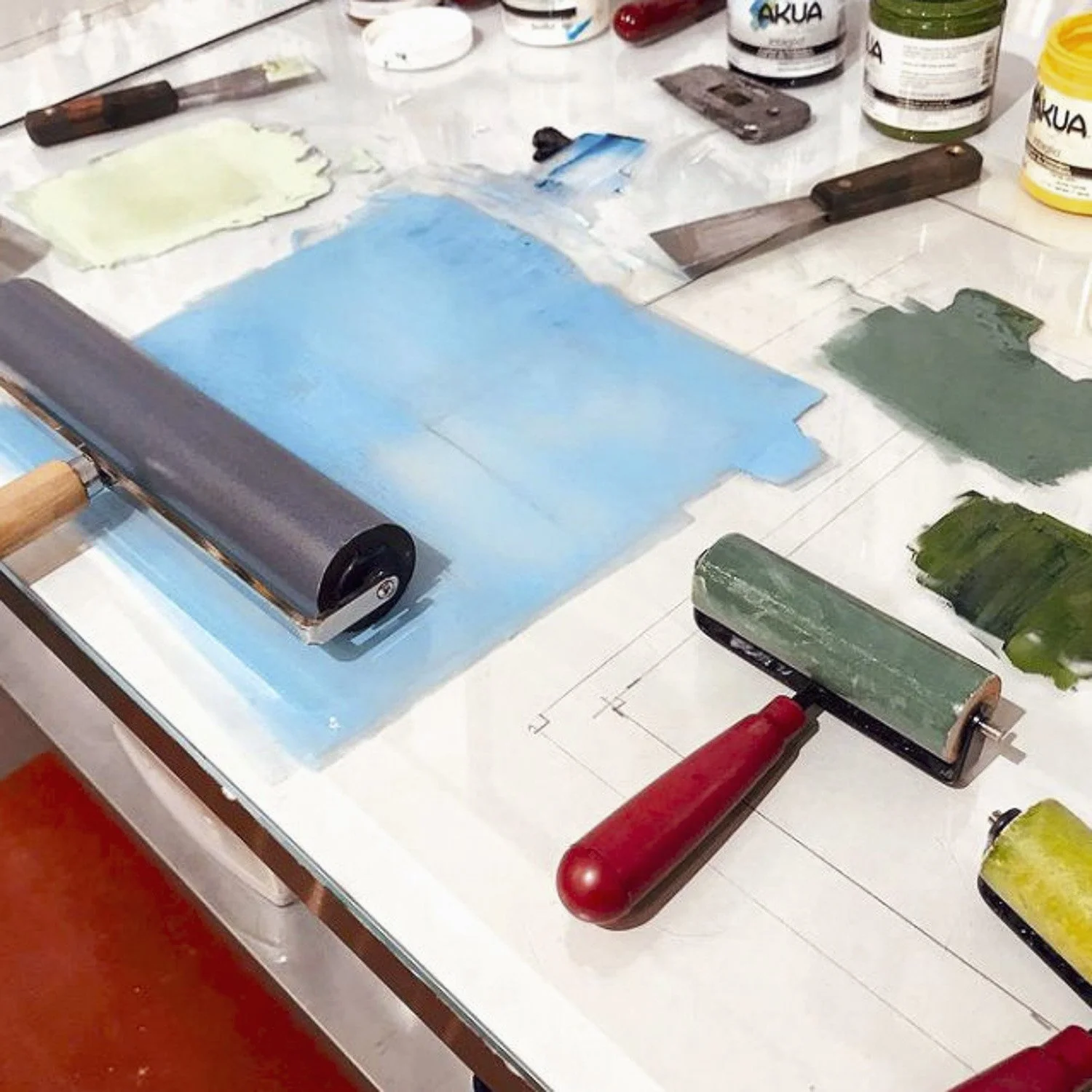 Matrixes that disappear after they are printed are called mono prints and mono types. For watercolor monotypes, gum arabic helps the ink/paint adhere to the non porous surface that is then printed under pressure to dampened paper. Akua intaglio ink can be rolled, brushed on and wiped off of the surface of a plate to create mono prints. Mono prints are improvisational and mostly non-repeatable and unique. There are infinite variations that can be achieved, and one print can inspire the next. Other forms of this type of printmaking utilize unusual materials like Tetra Pak packaging, collaged surfaces with textures and carborundum, gelli plates, etc.